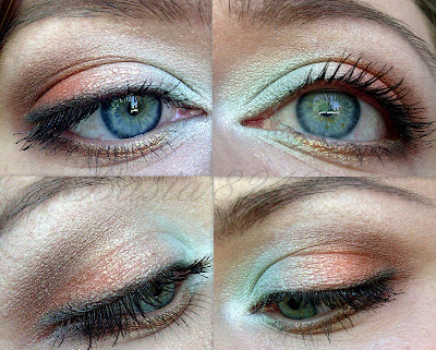 W wewnętrznym kąciku cień Bellini,dalej 1/3 powieki ruchomej Inglot,na to położony cień La Rosa Tourmaline,następnie troszkę cienia Sleek Bellini,następnie na ruchomej powiece cień Persian Orange(od środka do zewnętrz.kącika) i w załamaniu odrobina roztartego cienia Kobo.