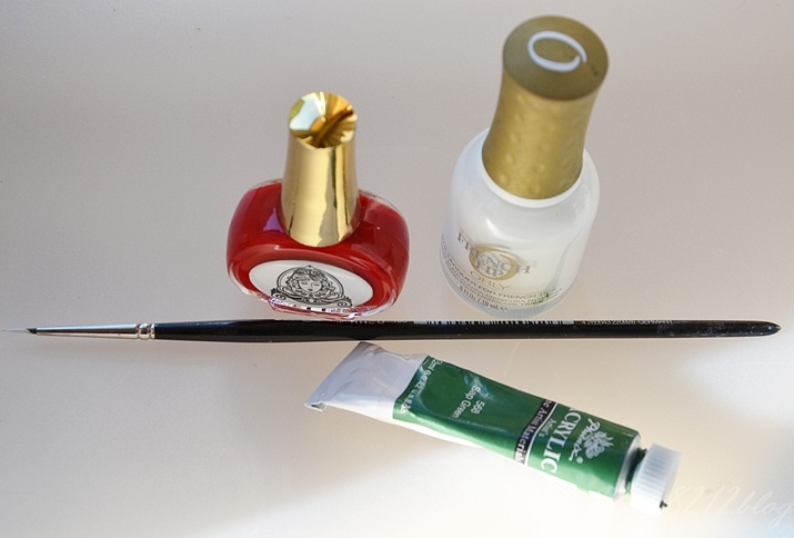 Do wykonania takiego manicure,potrzebny nam jest czerwony i biały lakier bazowy,farbka zielona i cienki pędzelek.